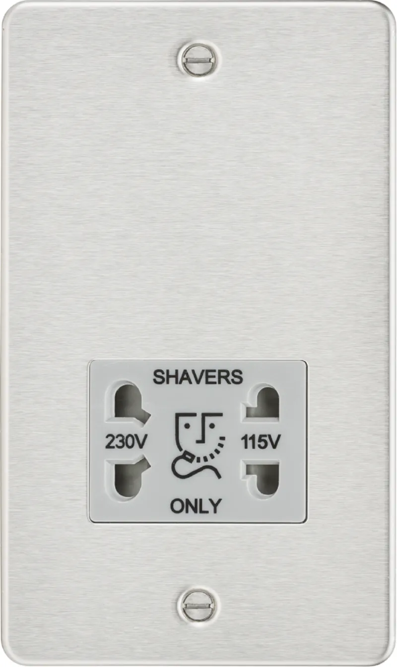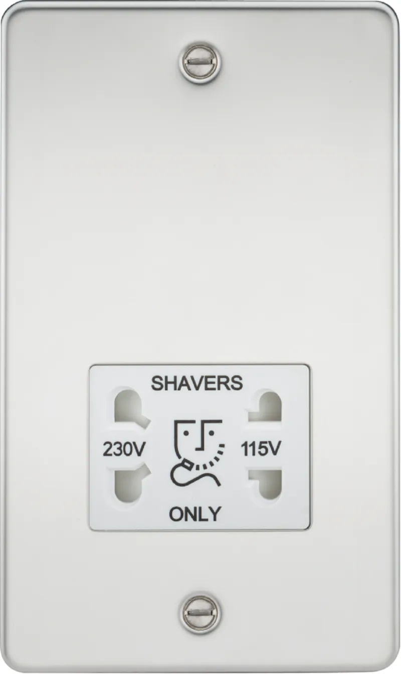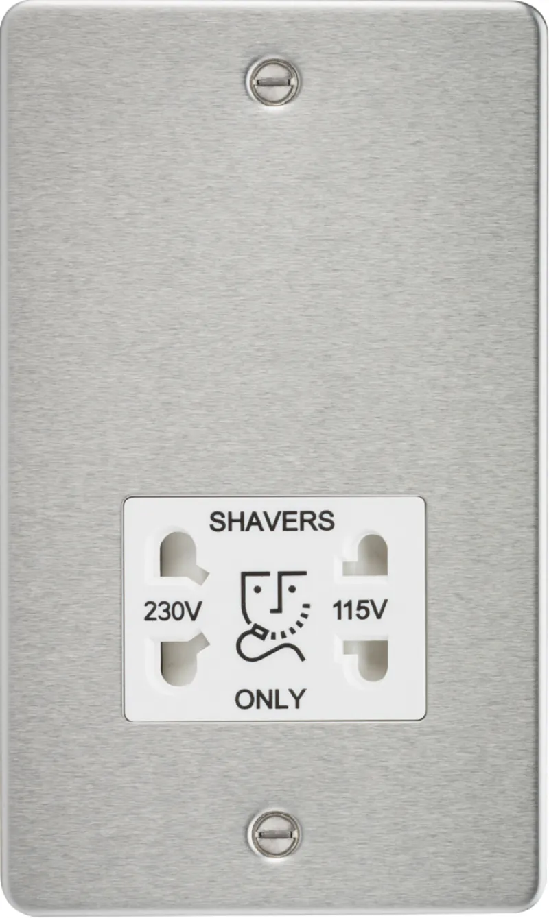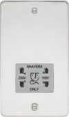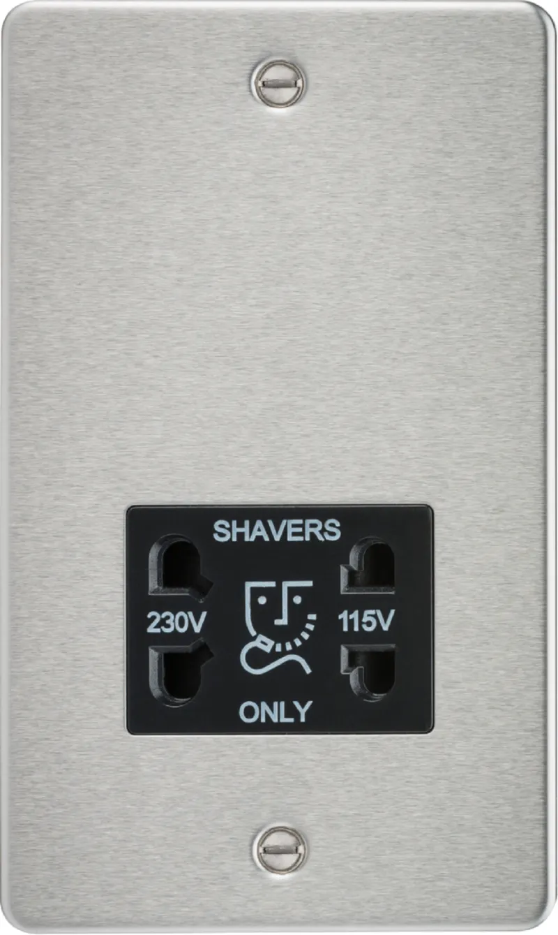 Perfect upgrade to any bathroom, dual voltage shaver socket, Flat Plate low profile metal design.115/230VAC 20VAIP41Dual Voltage Shaver SocketUltra low profile design with built in gasketCertified to EN 61558Minimum mounting box depth: 47mm