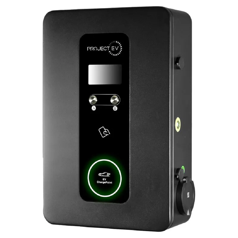 The EVA-SE-W EV Charger from Project EV is an untethered dual socket single phase AC electric vehicle charger with RFID card compatibility available in either dual 7kW Single Phase or dual 22kW 3-phase options.