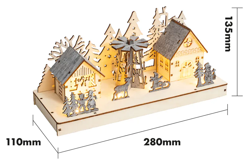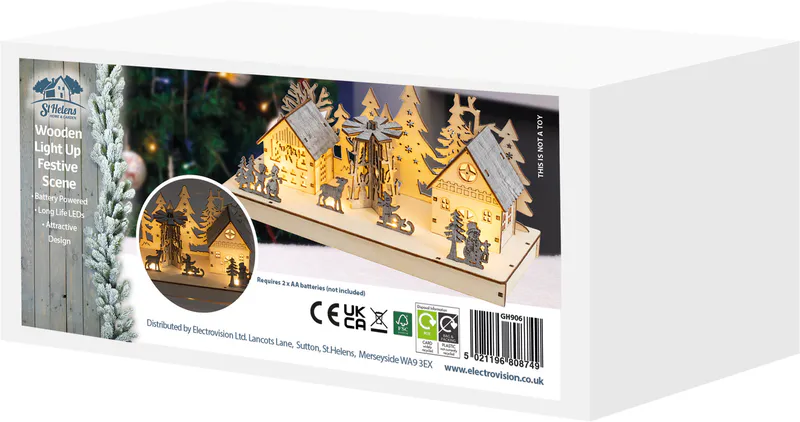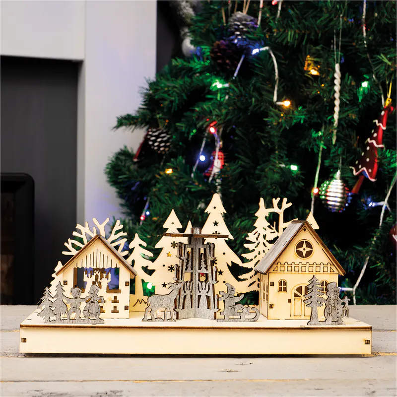 This beautifully crafted light up festive scene will look perfect on your window sill or table tops, in fact anywhere you want to create a wonderfully festive atmosphere. This LED festive scene is a fantastic alternative to the traditional Christmas candle bridges. Made from wood sourced from an FSC accredited manufacturer. The scene features festive carvings such as snowmen, reindeers, Christmas trees, stars, sledging children and houses in natural wood tones. The LED s are placed underneath the carvings to create festive silhouettes .The scene is battery operated, simply insert 2x AA batteries (not supplied) and enjoy this festive light in the comfort of your own home.